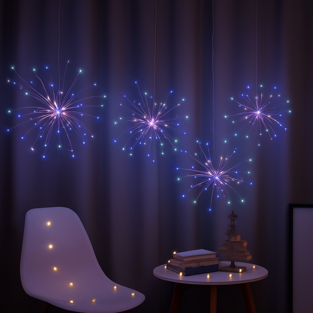 Μετέτρεψε οποιονδήποτε χώρο σε ένα ονειρικό, μοντέρνο περιβάλλον με τα Φωτιστικά Οπτικών Ινών σε Σχήμα Πυροτεχνημάτων LED. Κάθε φωτιστικό δημιουργεί μια μαγευτική έκρηξη χρωμάτων, με λεπτές ίνες που εκπέμπουν απαλούς τόνους μπλε, μωβ και πράσινου, θυμίζοντας τη μαγεία των πυροτεχνημάτων στον νυχτερινό ουρανό.