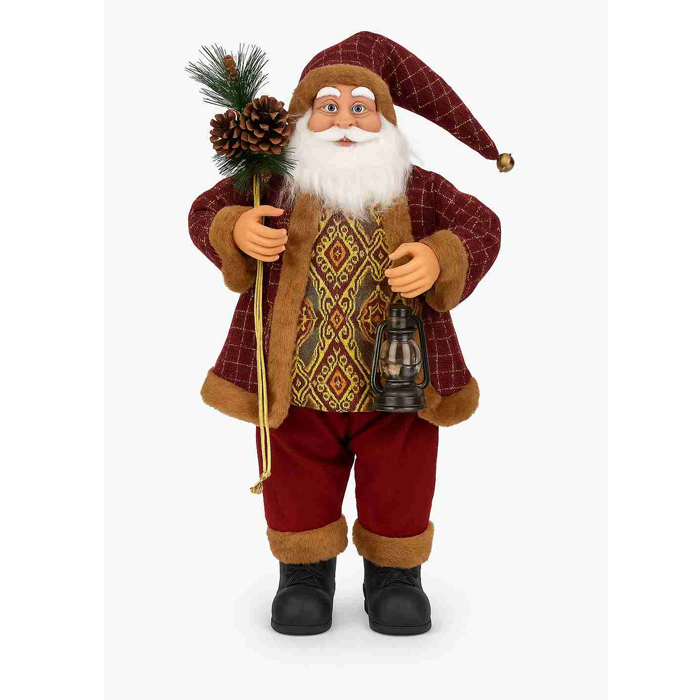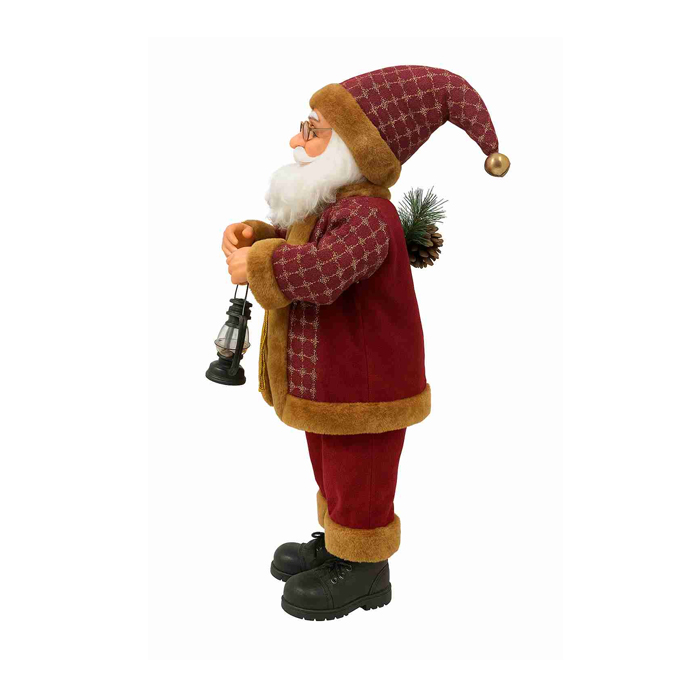 Χριστουγεννιάτικη διακοσμητική αληθοφανής φιγούρα άγιου Βασίλη με μπορντό φορεσιά με γούνινες λεπτομέρειες. Κρατάει ένα φαναράκι, και έχει στην πλάτη του κουκουνάρι