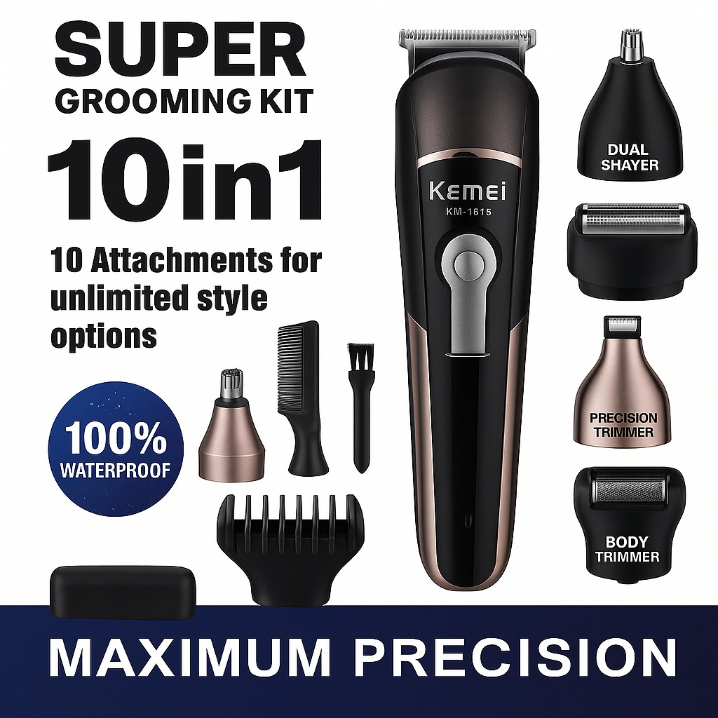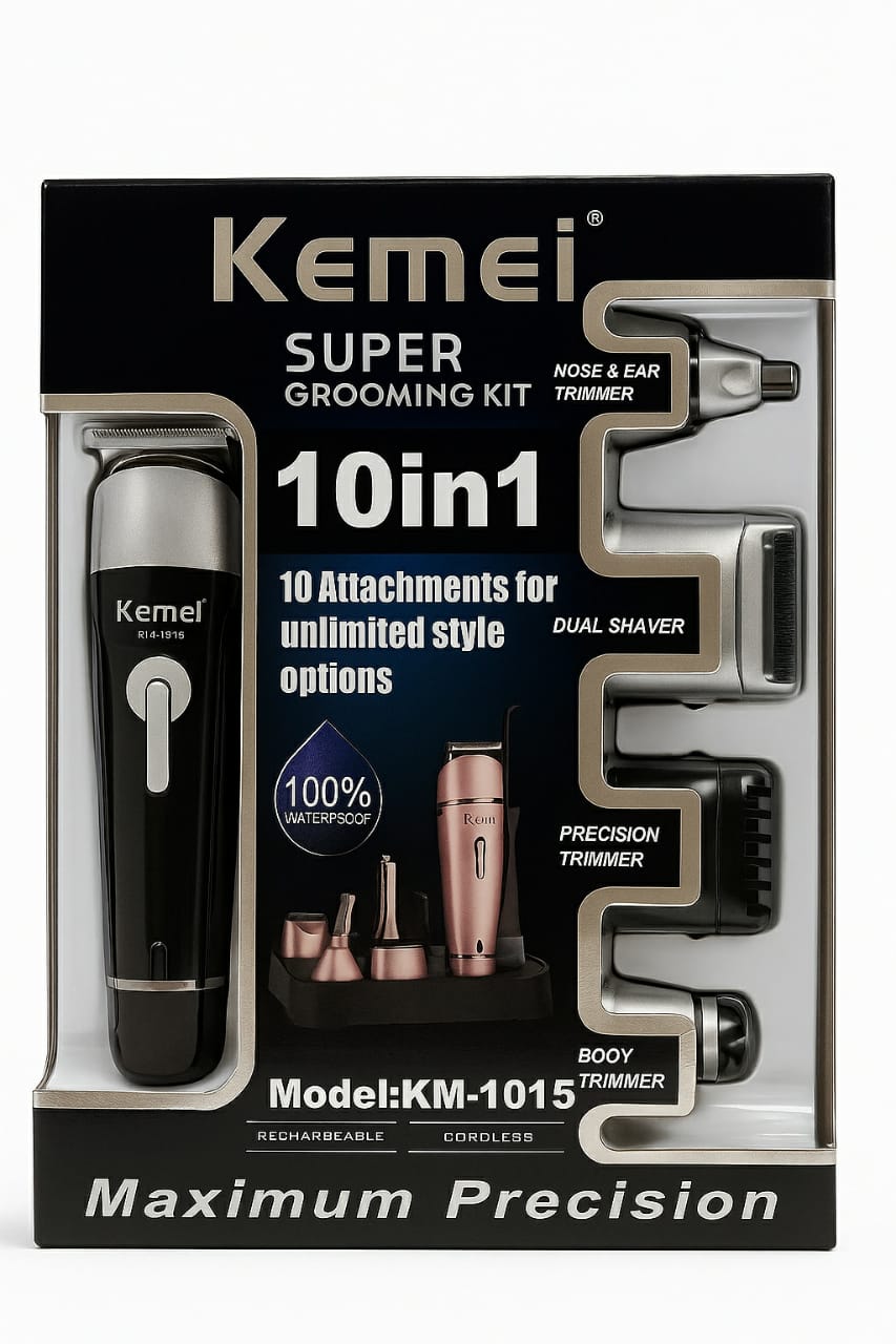 Το Kemei KM-1015 10-σε-1 είναι η απόλυτη λύση για άνδρες που θέλουν τέλεια εμφάνιση με ευκολία. Διαθέτει 10 εναλλάξιμες κεφαλές για κάθε ανάγκη — από περιποίηση γενειάδας και ξύρισμα, έως καθαρισμό μύτης και σώματος. Το αδιάβροχο σώμα του επιτρέπει χρήση στο ντους και εύκολο καθαρισμό, ενώ ο εργονομικός σχεδιασμός προσφέρει άνετο κράτημα. Ιδανικό για καθημερινή χρήση ή ταξίδι.