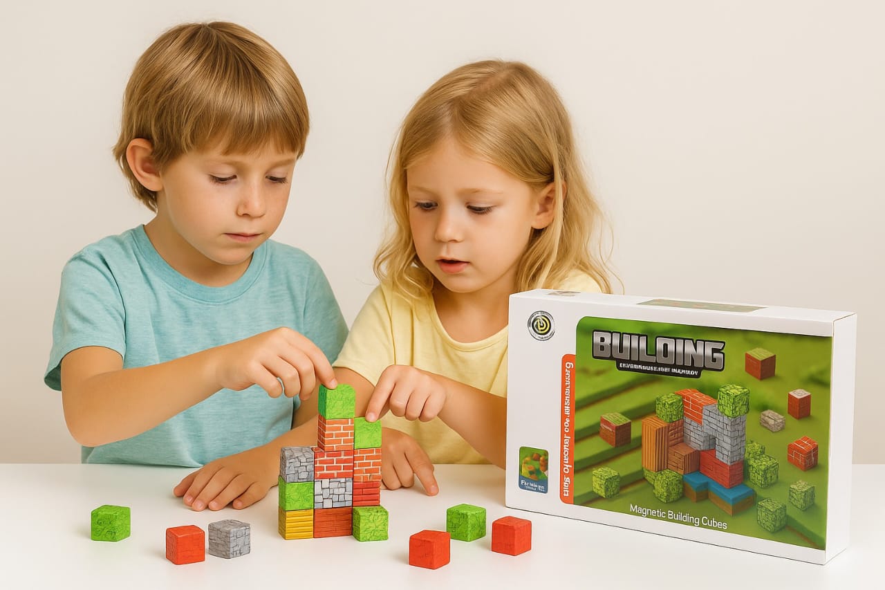 Οι κύβοι ενώνονται εύκολα με ενσωματωμένους μαγνήτες, επιτρέποντας τη δημιουργία σπιτιών, πύργων και πολύχρωμων σχημάτων.